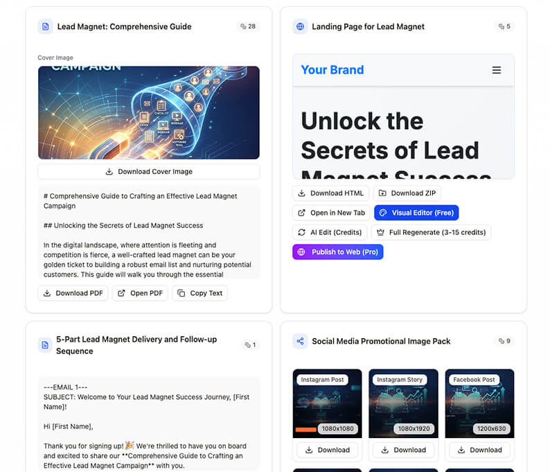 Get ready-to-use PDFs, emails, landing pages, images, scripts, and more — fully assembled.